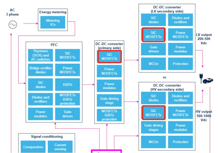 随着新能源汽车800V平台的出现,主流充电模块也从之前主流的15、20kW向30、40kW发展,输出电压范围300Vdc-1000Vdc,并且具备双向充电功能,以达到V2G/V2H等技术要求。因此,越来越多充电模块企业开始采用SiC MOS方案。